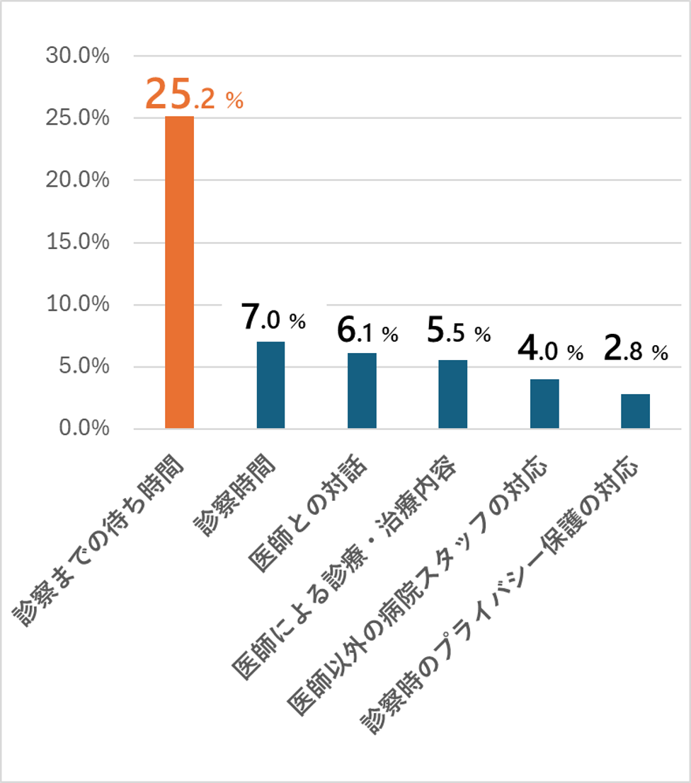 厚生労働省の受療行動調査では、患者の満足度を項目別に尋ねていますが、外来で群を抜いて不満の多い項目が「診察までの待ち時間」です。これに「診察時間」「医師との対話」「医師による診療・治療内容」などが続きますが、不満を感じる患者の数は、待ち時間ほど多くはありません。(図2)従って、まずは待ち時間をいかに短縮するかに注力すべきです。