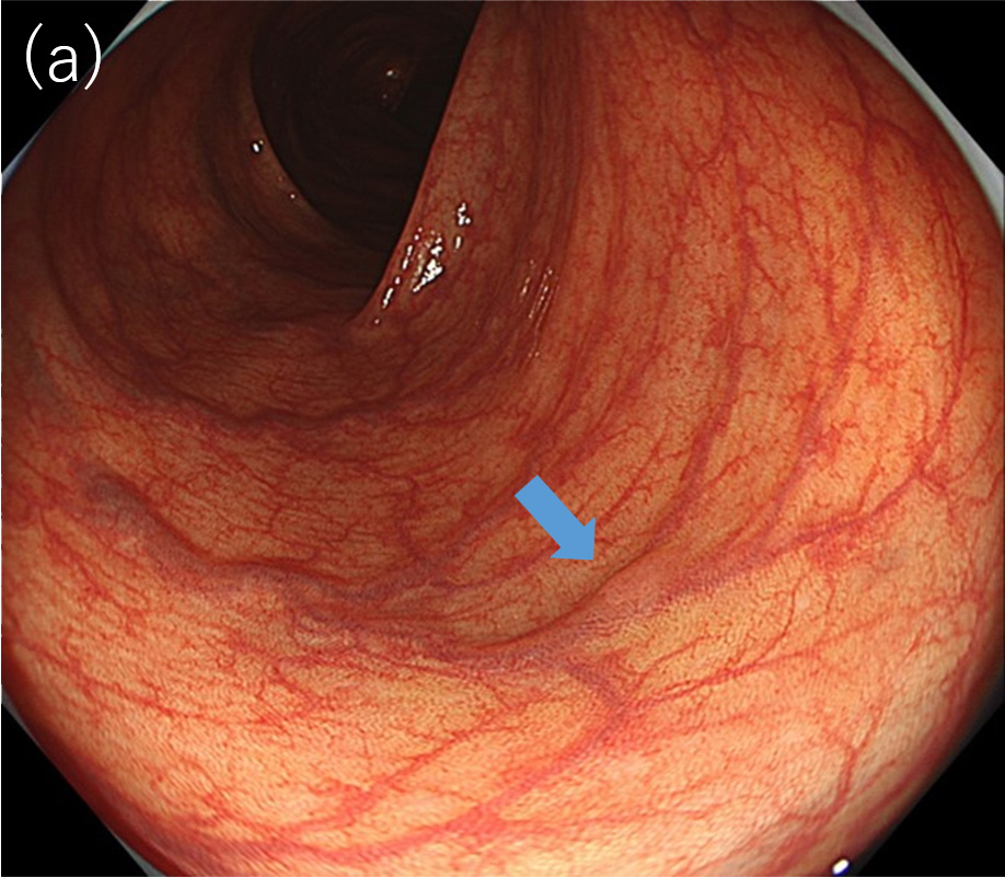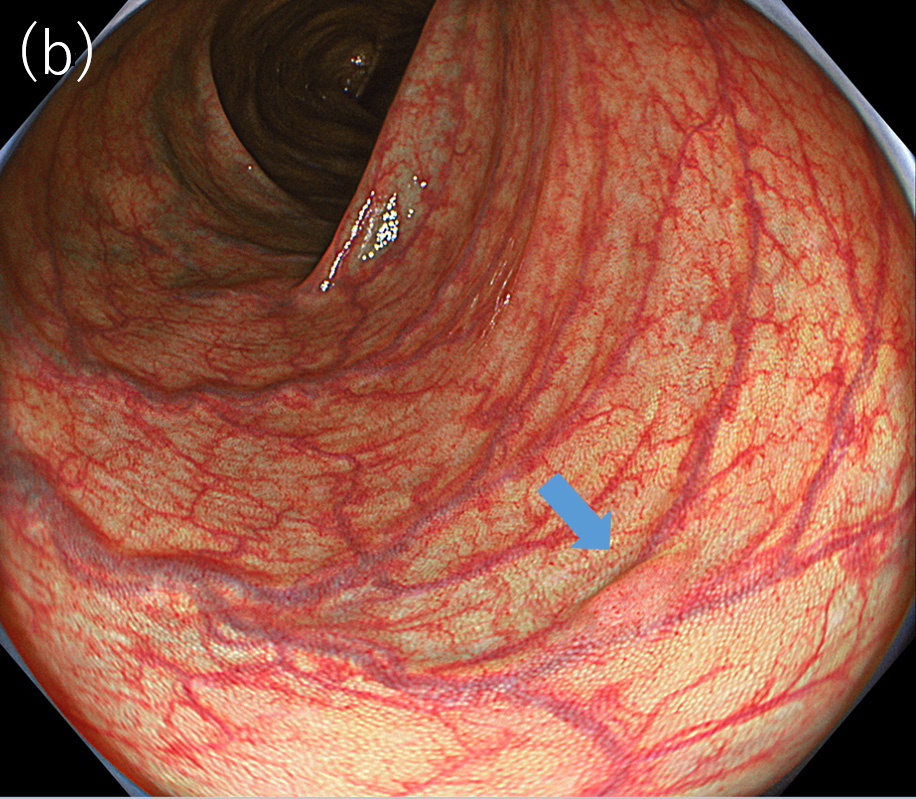 〈図1〉XZ1200による同一病変に対する中遠景観察像(a)白色光観察; (b)TXI観察(モード1)