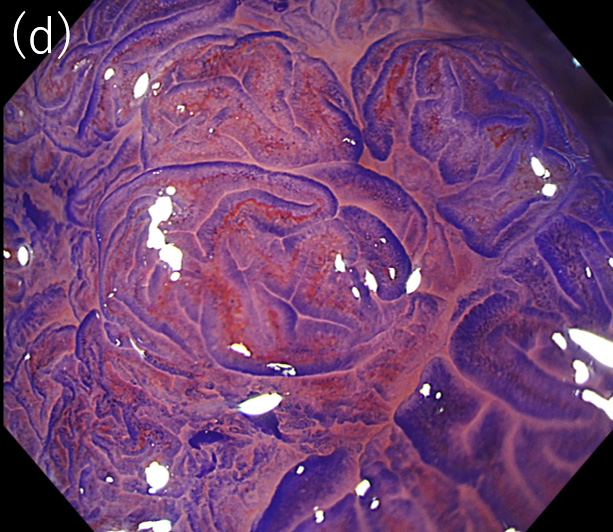 (d)クリスタルバイオレット染色後の拡大観察像(pit pattern:Ⅳ)