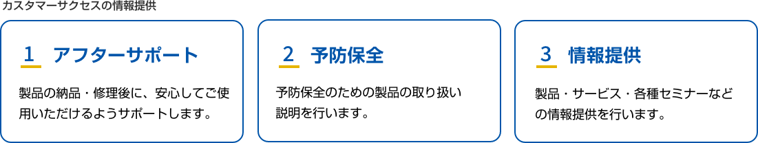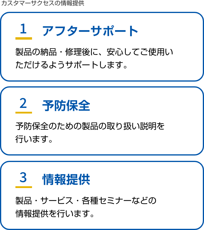 医療従事者の皆さまに安⼼してご利⽤いただけるよう、納品後や修理後、契約更新前などの節⽬にご連絡いたします。