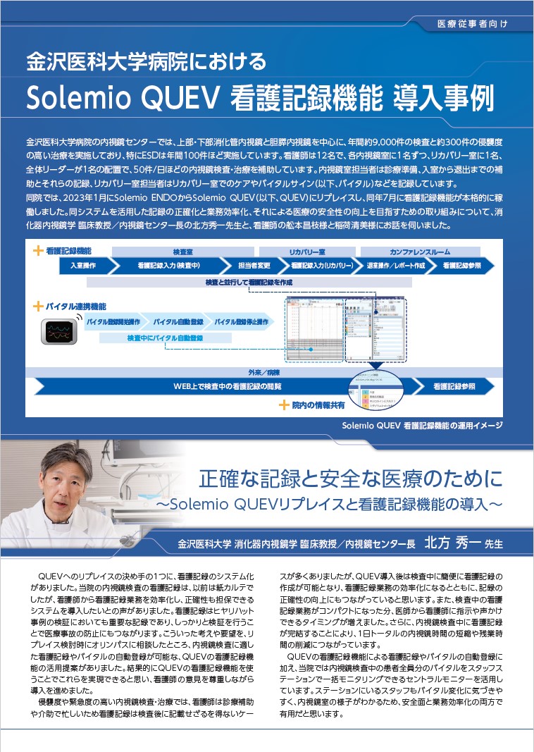 同院では、2023年1月にSolemio ENDOからSolemio QUEV(以下、QUEV)にリプレイスし、同年7月に看護記録機能が本格的に稼働しました。同システムを活用した記録の正確化と業務効率化、それによる医療の安全性の向上を目指すための取り組みについて、消化器内視鏡学 臨床教授/内視鏡センター長の北方秀一先生と、看護師の舩本昌枝様と稲荷清美様にお話を伺いました。