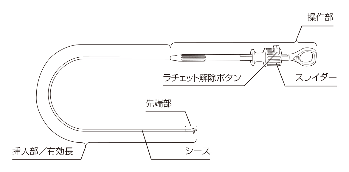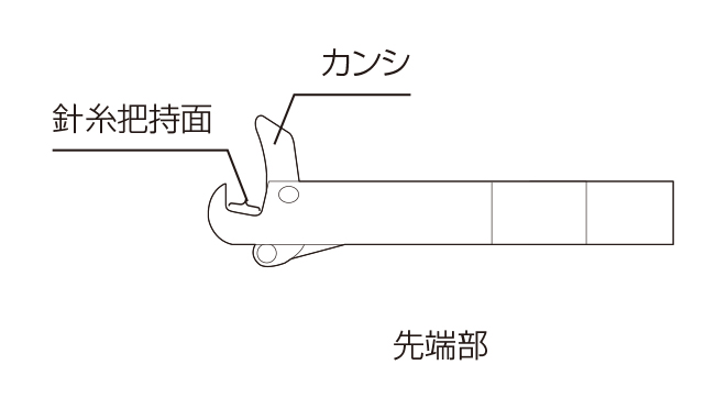 持針器は主に介助者(助手)が操作します。操作部のスライダーを握ることで先端部のカンシが針糸把持面に向かって下ります。操作部にはラチェット機能が備わっており、スライダーを握りこむことで徐々に把持力を高めることができます。また、対象を把持した状態を保持することができます。把持部を開く際はラチェット解除ボタンを押して、スライダーを前に押し出すことでカンシを挙上させます。回転追従性が高く、操作部を回転させることで先端部の角度を任意に変えることが可能です。
