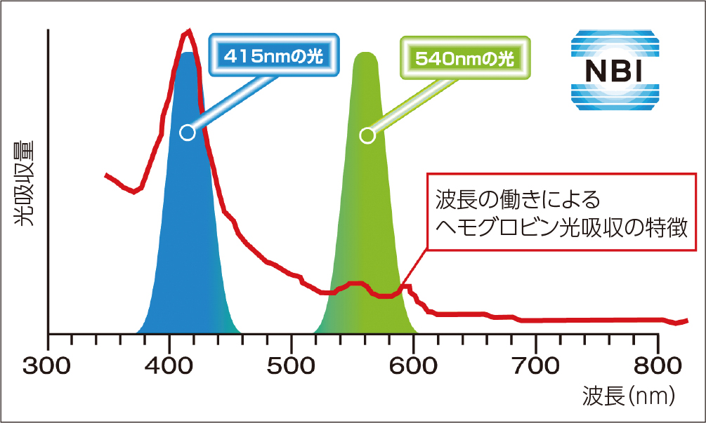 図1 NBIの光の波長。2つの特定の帯域に狭められた光がヘモグロビンによって強く吸収される。