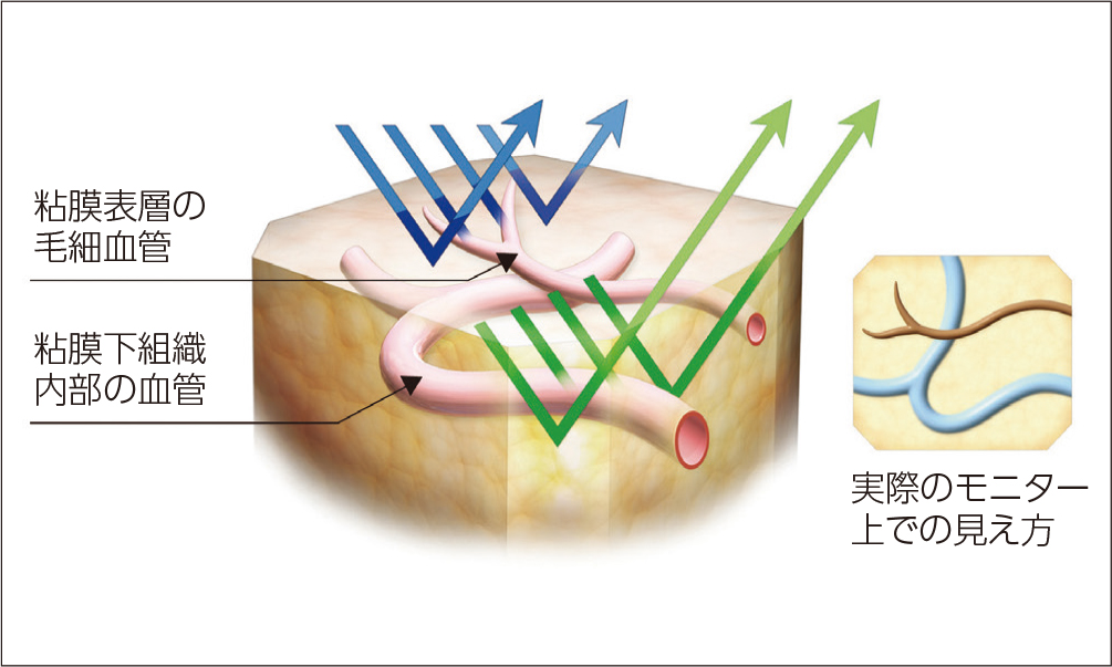 図2 NBIの光の波長が吸収される組織深度のイメージとモニターでの描出イメージ。