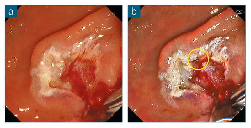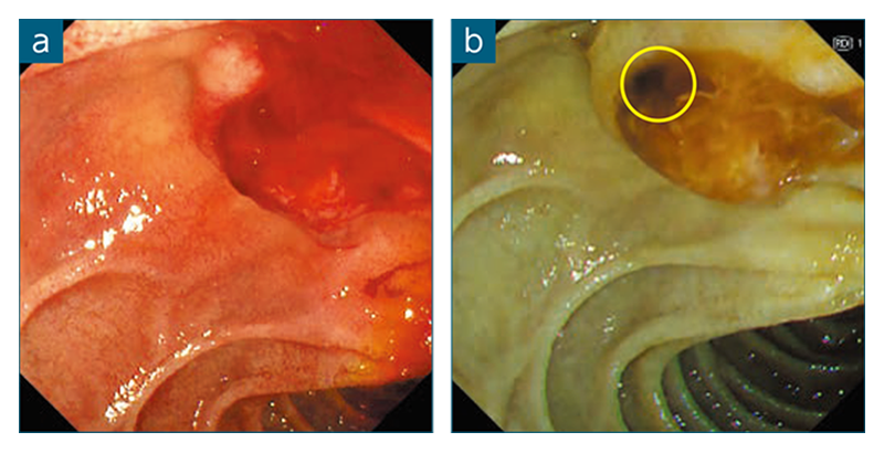 図1 TXIモードにより内視鏡的乳頭切除術(EP)後の総胆管・膵管開口部を同定 : WLI(a)、TXIモード1(b)