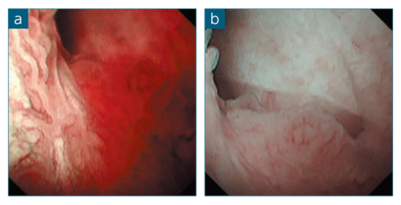 図2 ERCPにより乳頭部の出血点を観察:WLI(a)、RDIモード1(b)
