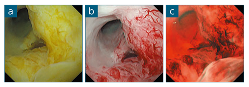 POCSにより総胆管に扁平な隆起領域を認めたため、狭帯域光観察(NBI)に切り替えて観察したところ、悪性を示唆する異常な血管を認めたが、胆汁により視認性が不良であった。そのため、NBIからRDIモード3へ切り替え、胆汁の彩度を下げて観察することにより、異常血管に対して明確な視野を得ることが可能となった(図3)。