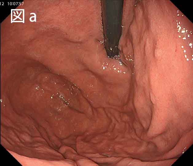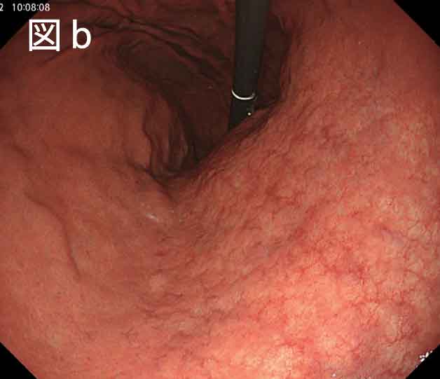 このジレンマを解消すべく2020年3月に登場したのが、次世代細径内視鏡GIF-1200Nです。GIF-1200N はGIF-XP290Nを超える明るくノイズの少ないハイビジョン高精細画像で観察ができ、一方で先端部を太くすることなく5.4mmと極細径を維持しつつ挿入時の苦痛を犠牲にすることはありません。実際に従来の細径内視鏡では良い意味ではコシがあったのですが、咽頭から梨状窩を超える際にはやや硬さを感じていましたが、GIF-1200Nの経鼻での挿入時にはそのような硬さを感じることはなく、非常に滑らかに挿入が可能です。さらに、GIF-XP290Nまでの細径内視鏡では、胃噴門部の反転観察をする際に、アップアングルを最大にしても不十分に感じることがあり、左右アングルの共同で何とか観察をすることもありました。GIF-1200Nではカタログ上のアップアングル角は210度従来と変更はありませんが先端部分以外の剛性を変更したことにより反転操作の視認性が向上していると感じました (図a)。このようにGIF-1200Nを使用することにより、内視鏡スクリーニング検査において求められる低侵襲および高精度の検査が可能となったと言えると感じています。