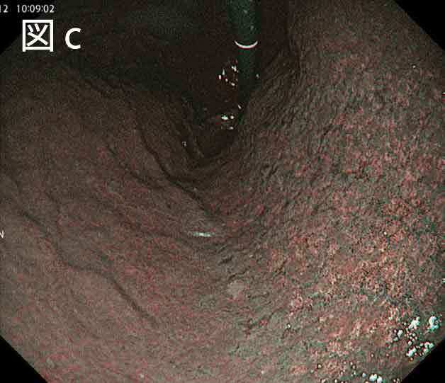 まず、従来NBI観察では主に拡大観察を併用することにより胃粘膜の微細血管構造、表面微細構造を評価し早期胃癌の診断や、腫瘍の病変範囲診断に有用な観察法として広く普及しておりますが、その名の通り、白色光に比較し波長の短い狭帯域光を使用する性質上、特に遠景が暗くなり視認性が低下することが問題でした。EVIS X1およびGIF-1200NでのNBI観察では、従来と比較し遠景の明るさが向上したために遠方の視認性が向上し、かつハイビジョン画像処理により近景の表在構造、血管が明瞭に確認できるようになりました(図c)。