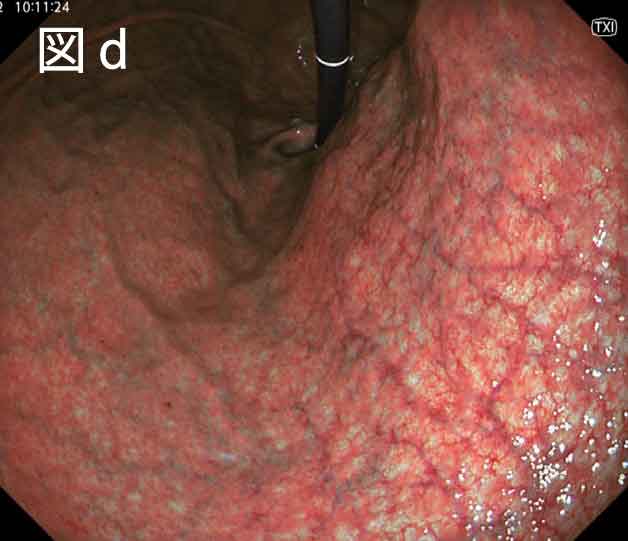 さらに、EVIS X1に搭載されたTXI では、通常光の情報に基づき、「明るさ補正」、「構造協調」、「色調強調」の3つの要素を最適化する画像強調処理が行われます。特にTXI モード 1では3つの要素を処理することにより粘膜表面の微細な構造、色調変化をとらえることが容易になります。このため胃炎の観察においては微細な表面凹凸変化、炎症による発赤、萎縮性変化による退色調変化が画像強調されることにより炎症・萎縮境界が明瞭になります(図d)。