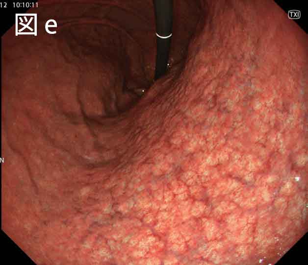 一方で、強調画像での観察には一定の「慣れ」が必要であり、強調画像での連続観察には抵抗がある方も多いのが実情かと思います。私もまずは白色光観察を行い、強調画像での検査は補助的に行っているのですが、そのような私でも今回のTXI のモードの一つである、TXI モード 2は非常に受け入れやすい強調画像がと感じています。TXI モード2は上記TXI モード 1の色調強調を行っていないモードですが、いい意味での画像強調感がなく、白色光観察と比較してもスクリーニングとして使用しやすいモードと感じています(図e)