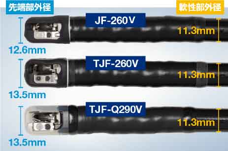 スコープ先端径はφ13.5mmでTJF-260Vと同等、最大外径はディスポーザブル先端カバー実現のためやや太くなっています(Fig.2)。スコープ先端の形状は実際に比べてみると、TJF-Q290Vの先端はやや角ばっている印象を受けますが、面取りされていて丸みを帯びています(Fig.3)。咽頭通過の際にはやや留意が必要ですが、食道狭窄や十二指腸狭窄が非常に強く、バルーン拡張を必要とするような症例以外では問題なく使用可能であり、ほぼ全ての症例でTJF-Q290Vを第一選択としています。