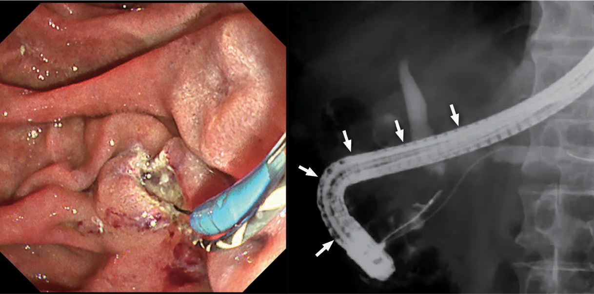 Fig.1 TJF-Q290V を用いることで、膵頭部癌による硬化(arrow)でスコープポジションが悪い中、膵管ガイドワイヤー法、Needle knife Precut、ステント留置まで完遂することが可能であった