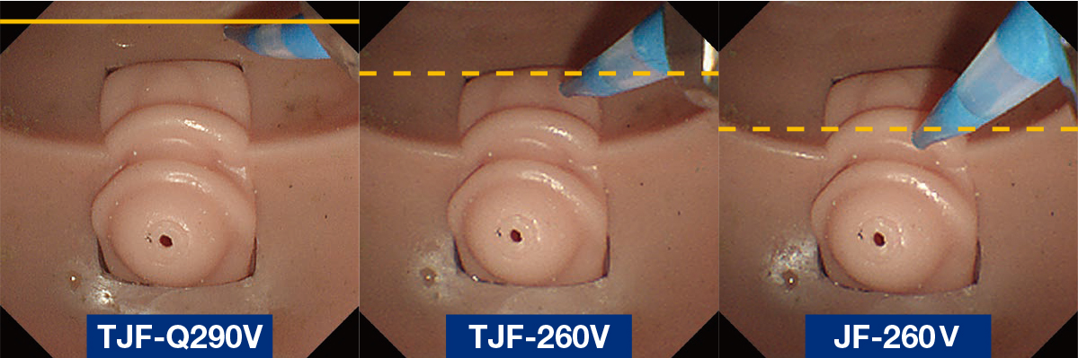 Fig.6 鉗子起上Max+Up angle Maxでのカテーテル位置比較。手前からTJF-Q290V、TJF-260V、JF-260V。