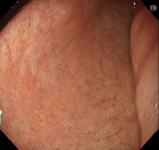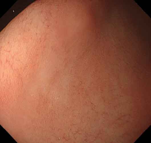 症例1と2はピロリ菌未感染者に診断された印環細胞癌の症例である。ピロリ未感染胃がんで診断される印環細胞癌は、胃体下部から近位前庭部大弯と胃角部にかけた帯状の中間帯に、褪色した粘膜域として診断されることが多い。この領域では、幽門腺と胃底腺が移行し、しばしば非癌の褪色粘膜斑もみられることから、その鑑別が重要となる。白色光観察では病変は白色の領域として認識されるが、その程度が淡く境界が不明瞭なことも少なくない。TXI (texture and color enhancement imaging)は、構造強調に加えて、色調も強調される画像強調法である。白色光観察に慣れた眼(脳)には、導入時には、やや強調の程度が強く感じられたが、慣れると微細な色調や構造の違いを強調し、病変の認識が容易となる。通常、印環細胞癌は胃底腺腺頸部から発生し、細胞質に粘液を蓄えつつ腺窩上皮にも発育してゆく。印環細胞の分布密度と表面までの距離は同一病変の中でも均一ではなく、これが近接観察における病変内の不均一性の要因と推定される。具合的例を以下に示す。