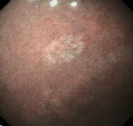 近位前庭部小弯に5㎜大の褪色粘膜を認める(図2a)。近接してNBIで観察すると病変と周囲粘膜とのコントラストはより明瞭となり、病変内の色調の分布も不均一なことがわかる(図2b)。インジゴカルミン色素内視鏡では、病変に一致してわずかな色素の貯まりを認めるが病変の境界および表面構造は不明瞭となる。(図2c)