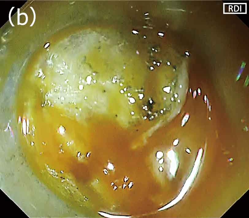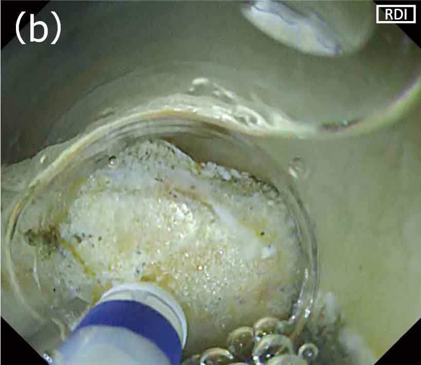 内視鏡的粘膜下層剝離術(以下、ESD)時に多量の出血が生じた場合、白色光観察では画面全体が赤くなるため、出血点の特定が困難となることがしばしばありました。出血点の視認性が低いなかでの高周波止血鉗子による凝固止血は、ピンポイントの止血操作が困難になるために治療時間の延長につながるだけでなく、過凝固による遅発性穿孔リスクを高めてしまう場合もあります。しかし、白色光観察では出血点の同定が困難な場面でも、RDI(Red Dichromatic Imaging:赤色光観察)モードに切り替えるとヘモグロビン濃度の高い出血点が濃いアンバー色として強調されますので、出血点の視認性が向上します(図1a,b)。また脂肪の多い胃の大彎側や回盲部におけるESDでは、脂肪により血管の視認性が低下するだけでなく、剝離時に脂肪がレンズに付着し視野が悪くなるため、処置がしづらくなります(図2a)。このような状態では剝離や止血処置が困難となり、処置に時間を要するだけでなく危険な状態になることがありました。しかし、RDIモードの特性により脂肪が目立たなくなり、よりクリアな視野が得られるため、処置がスムースに行えるようになります(図2b)。