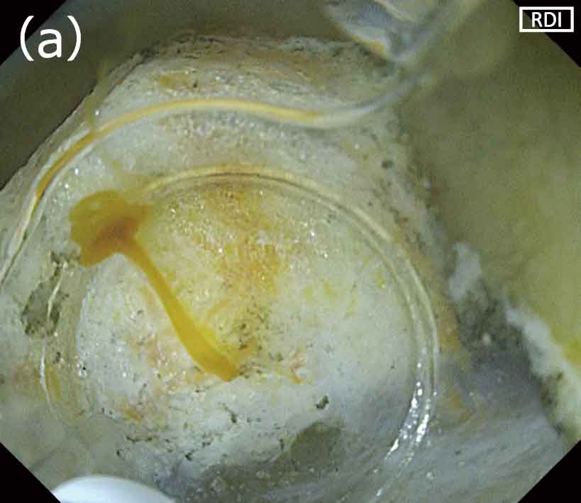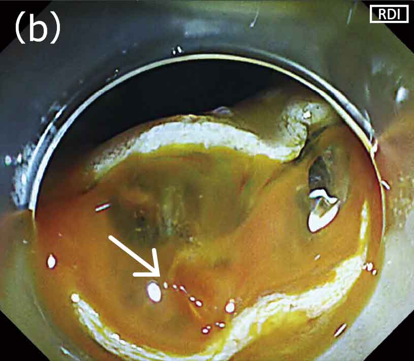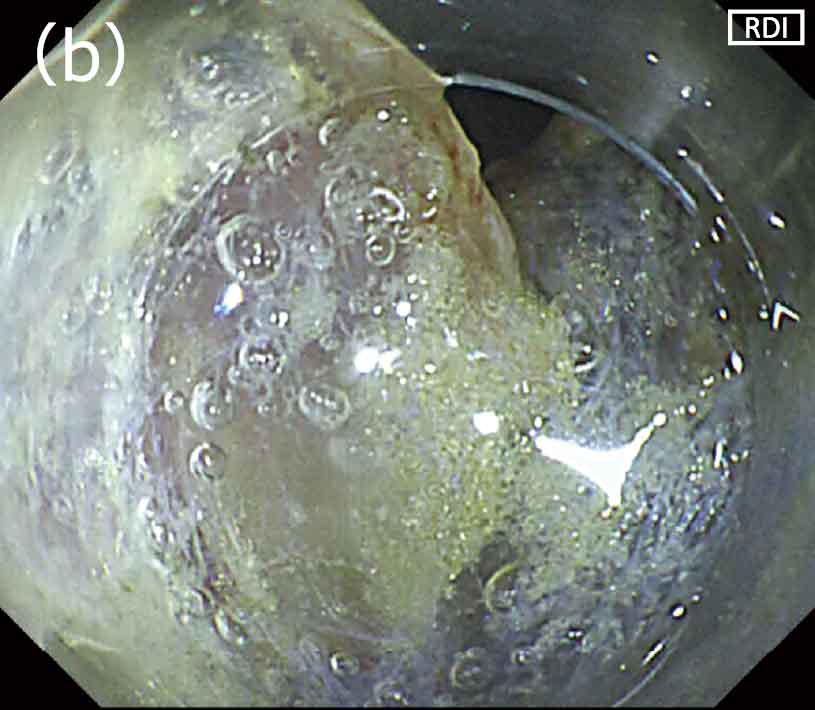 このような場合はRDIモードへ切り替えた後、吸引を行い、少しスコープを引いて遠景で処置部全体を俯瞰し、全体像を把握します。全体像とおよその出血点の位置を確認したら、近接して出血点付近を洗浄します。洗浄中に、RDIモード下ではフレッシュな血液が濃いアンバー色として描出されるため、出血点を正確に同定することができます。特に水分の溜まる位置では、従来の白色光観察では洗浄しても全体が赤くなってしまいなかなか出血点の同定が困難でしたが、RDIモード下では出血点がアンバー色として描出されるため止血処置が容易になります(図5a,b)。