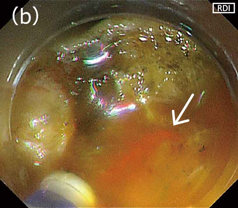 〈図1〉出血点の視認性(a)白色光観察;(b)RDIモード