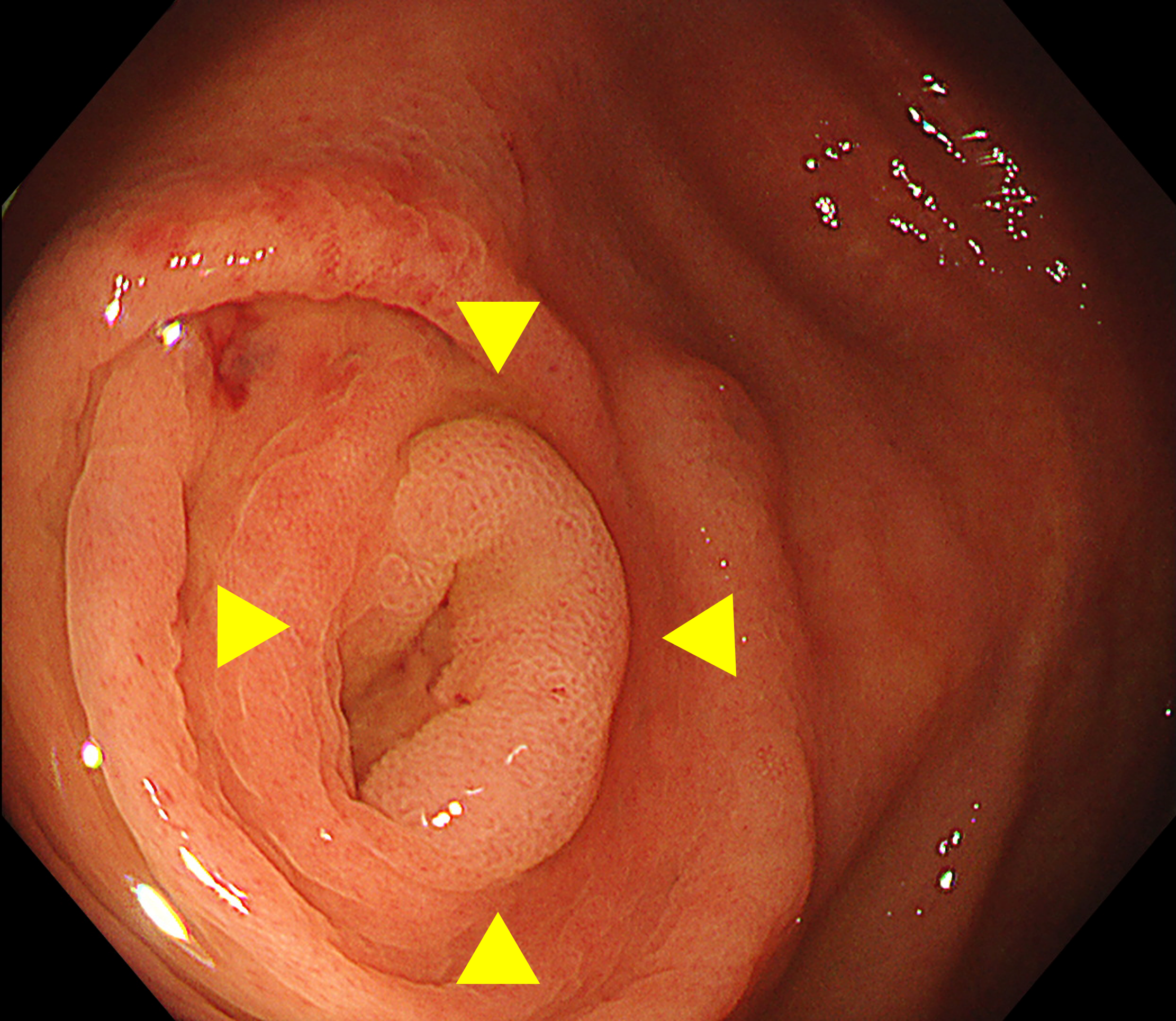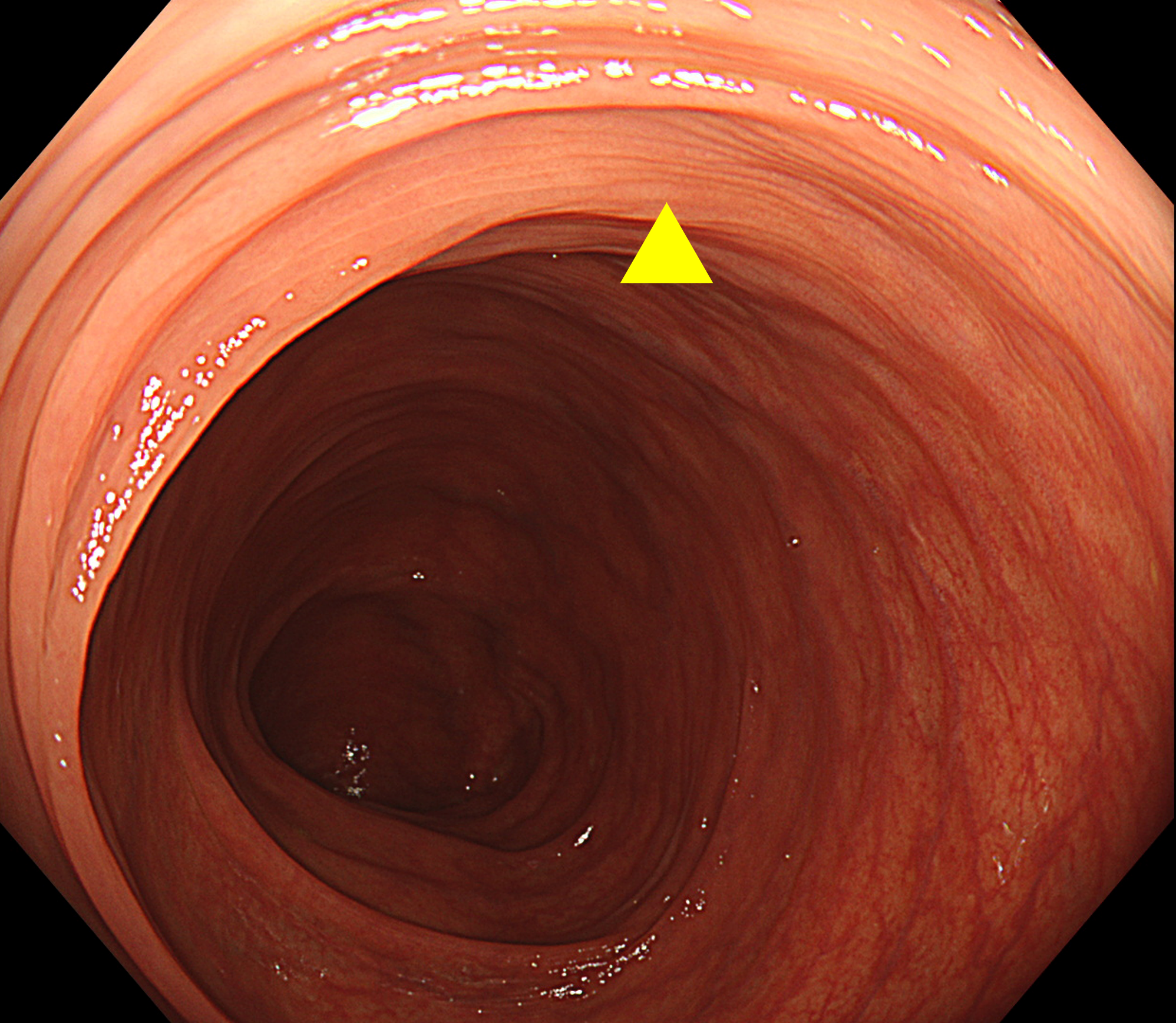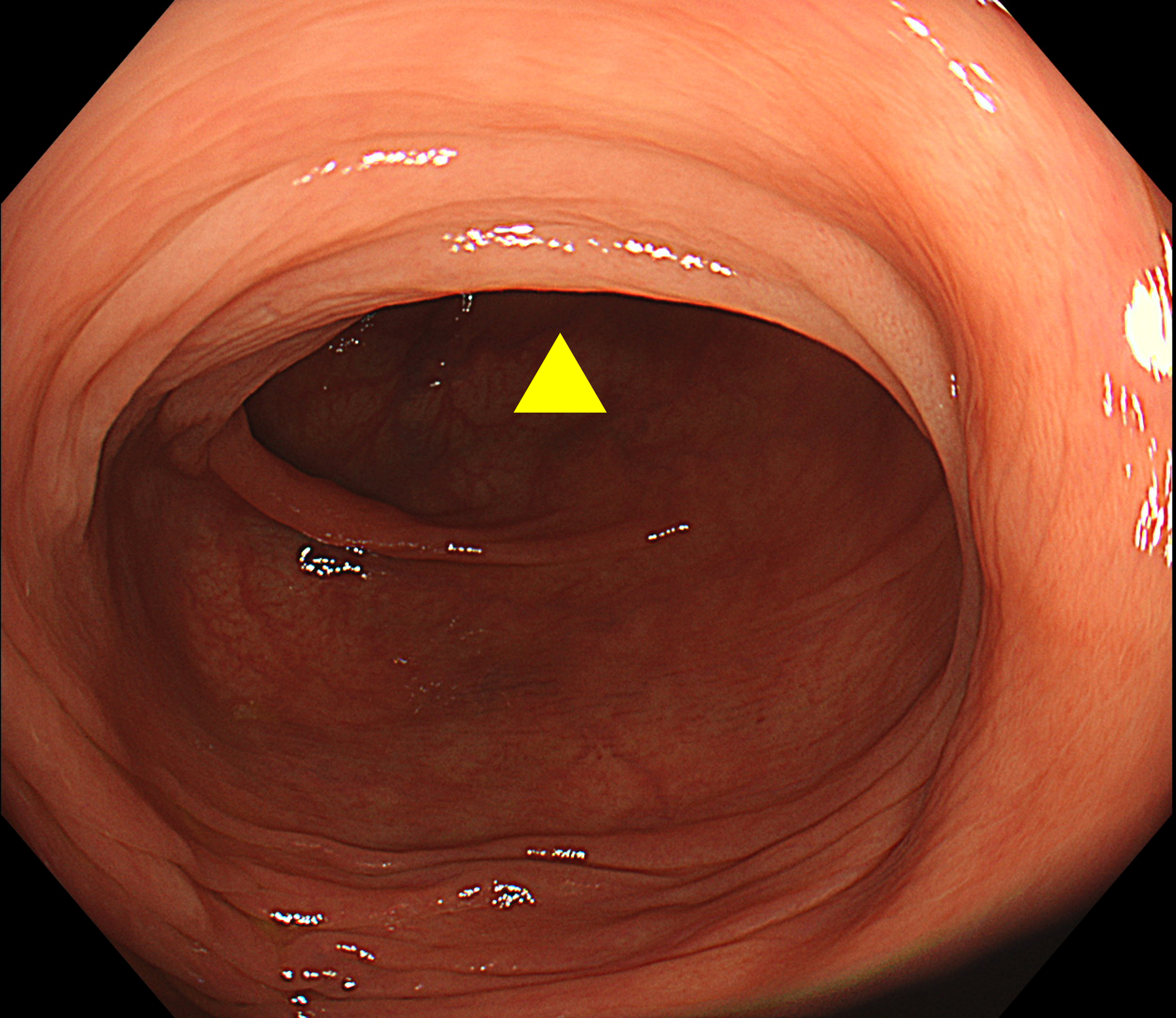 盲腸では、虫垂開口部周囲や回盲弁の裏側が死角となりやすい(※Figure1)。盲腸底部から全体を俯瞰するように観察し、回盲弁は唇裂部を意識して十分に送気・近接観察を行うことが重要である(※Figure2)。