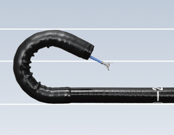 先端部の加工は挿通抵抗を軽減し、カップの噛み合わせのズレや外観のバリを最小限に抑えた設計で、スコープにとって愛護的な構造になっています。シースは柔らかくしなやかな素材を採用しているため、挿通時のスコープへの影響を軽減し、アングルをかけた状態で挿通してもアングル戻りが発生しにくい設計としました。