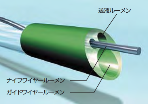 ナイフワイヤルーメン、送液ルーメン、ガイドワイヤルーメンの3つのルーメンを最適にレイアウト。