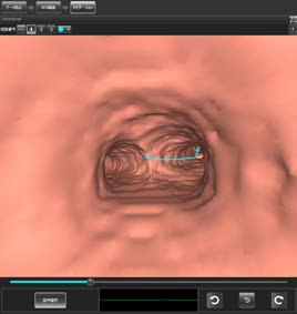 -  仮想内視鏡画像の再生   設定された対象へのルート情報が自動的に作成され、仮想気管支鏡画像として再生することができます。