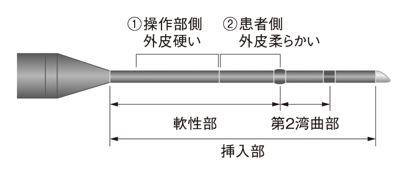 患者さんが最も痛みを感じる膜様部付近。この部位に当たる軟性部患者側は柔らかく、手元操作側はスコープ挿入時のプッシャビリティを考慮してコシの強い構造となっています。