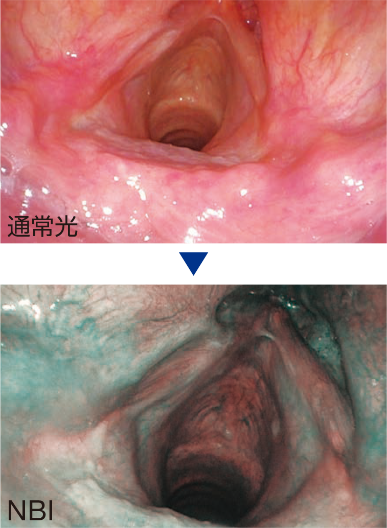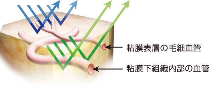 NBI(NarrowBandImaging)は、粘膜表面上の血管と組織をより見えやすくする、オリンパス独自の光学的な画像強調技術です。2つの特定の帯域に狭められた光が、ヘモグロビンによって強く吸収されます。モニター上では粘膜表層上の毛細血管が茶色に、粘膜下組織内部の血管が青緑色に表示されます。