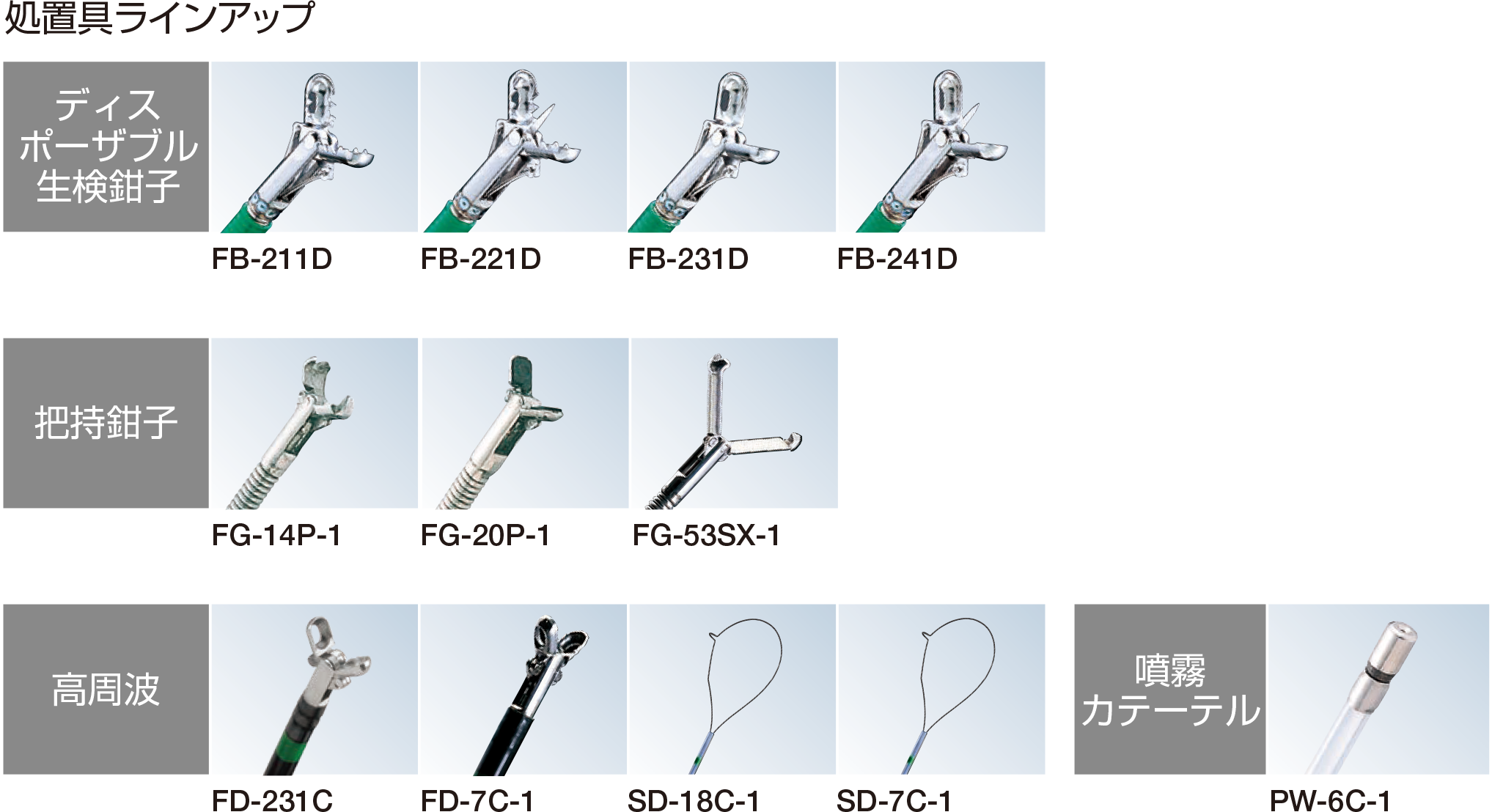 処置具は用途に応じて自由にお選びいただけるよう豊富なラインアップをそろえました。レーザー/高周波治療のいずれにも対応しています。