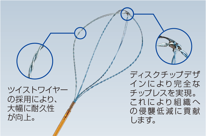 先端にラウンドチップディスクを採用することで、より低侵襲な手技をサポートします。またシングルワイヤーの採用により、狭い腔内でも開閉が容易になりました。