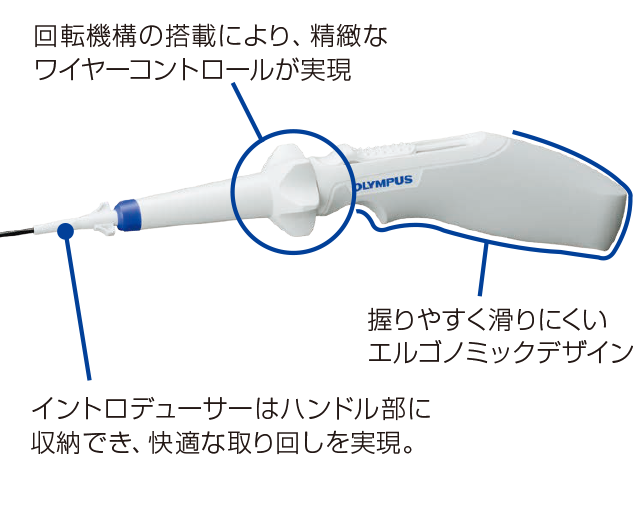 エルゴノミックデザインのハンドルには、バスケットワイヤー回転機構を搭載。結石アプローチ時に精緻なワイヤーコントロールが可能となります。