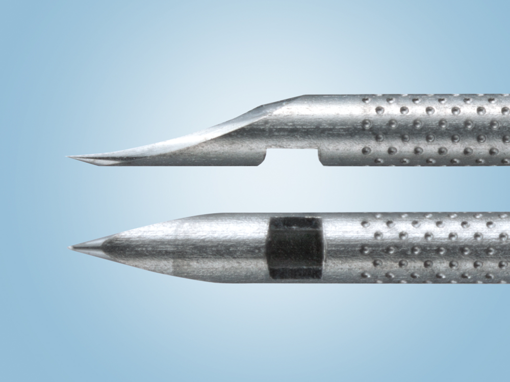 針先を鋭利な角度で加工したメンギーニ形状を採用。硬い組織でもスムーズに刺せる高い穿刺性を追求しています。