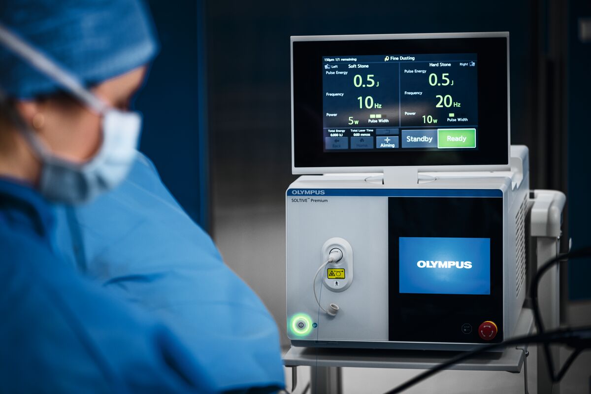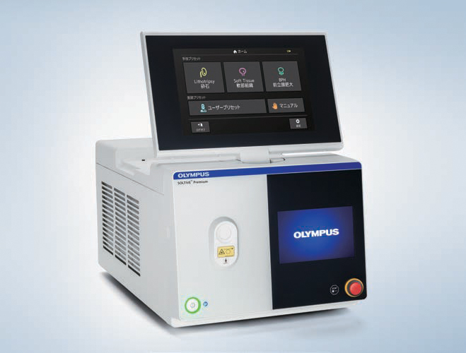 オリンパスは最先端のツリウムファイバレーザシステムで、結石砕石術、前立腺肥大症手術および軟部組織の処置をサポートします。ツリウムファイバレーザはHo;Yagレーザと比較して水への吸収効率が約4.5倍高く、より多くのエネルギーを結石内の水分に照射することができます。