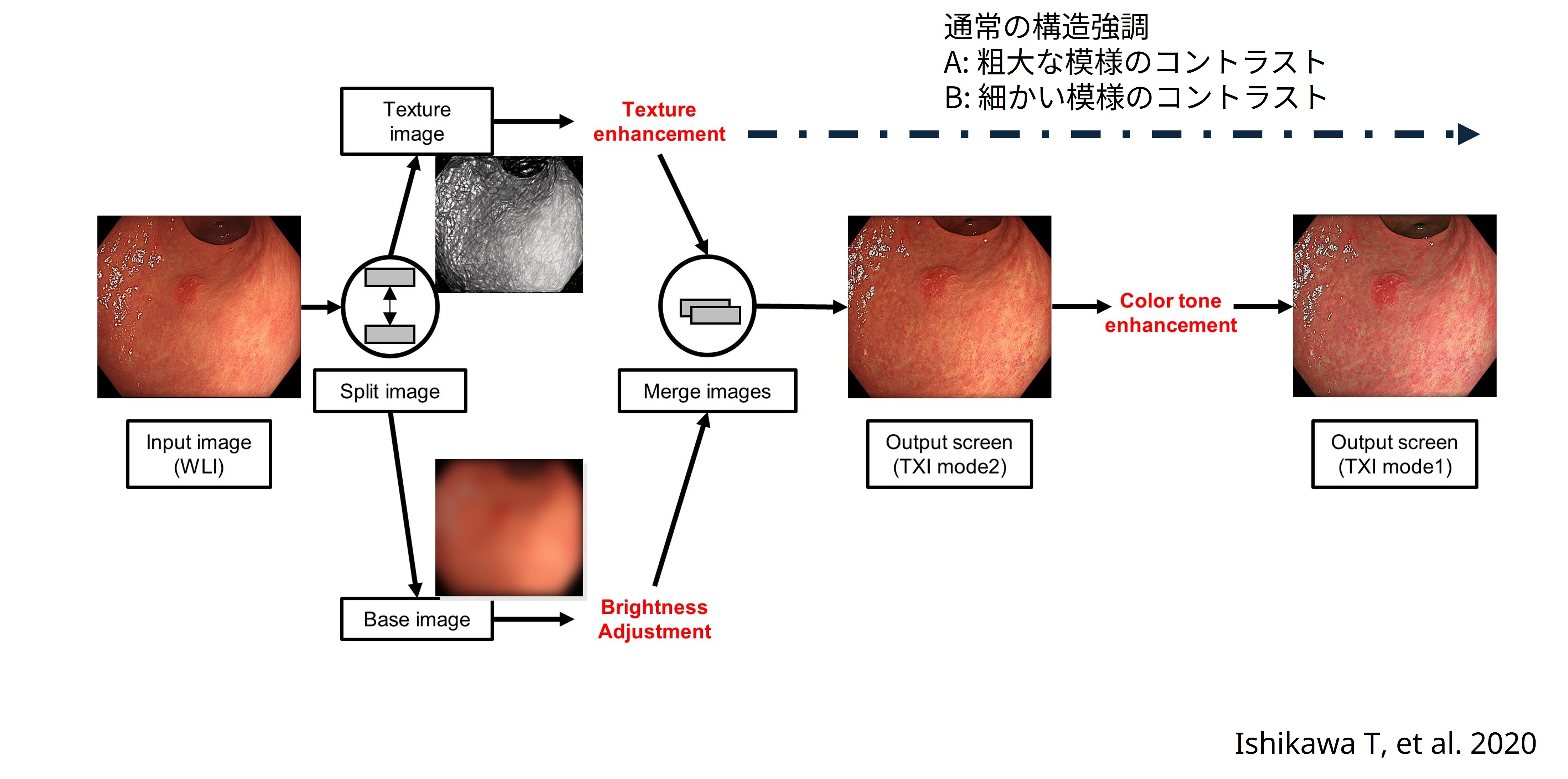 消化器分野における軟性内視鏡の一技術としての画像強調内視鏡(IEE)は有用であり内視鏡観察のモダリティーとして広く普及してきた。IEEの中にはデジタル法(LCI、TXIなど)、光デジタル法(NBI, BLI, RDIなど)およびコントラスト法(インジゴカルミン溶液散布)や染色法(ピオクタニン染色など)が存在する。光学的な技術としてはデジタル法や光デジタル法が主であり、主に病変の存在診断や質的診断に有用とされ普及してきた過去がある。 近年オリンパスメディカルシステムズ株式会社よりリリースされた内視鏡用光源システムEVIS X1は最新式のLED光源を備えたシステムであり新たな色味としてAmber色を加えたことで、Violet, Blue, Green, Amber, Redの5色光源となった。白色光ではこれらすべてを同時に、あるいは面順次に照射することで画像を得る仕組みである。面順次色においてはViolet/ Blue, Green, Amber/Redの3組の色調が照射される。NBIはこれらのうち、Amber/Redをフィルターによってカットすることで短波長帯の狭帯光を照射し腫瘍の識別や拡大観察による表面微細構造の観察を容易とする。TXIは比較的新規のIEEである。このモードでは照射される光色帯については白色光と同一であるものの、取得した画像をテクスチャー画像とベース画像に分割し、それぞれテクスチャー強調(従来の構造強調とは異なる)および明度の調整をかけることで全体的に明るく構造の視認しやすいTXI mode2が出力される。そして, さらに色彩の強調をかけることで色調の変化を強くしたTXI mode1が出力される仕組みである。