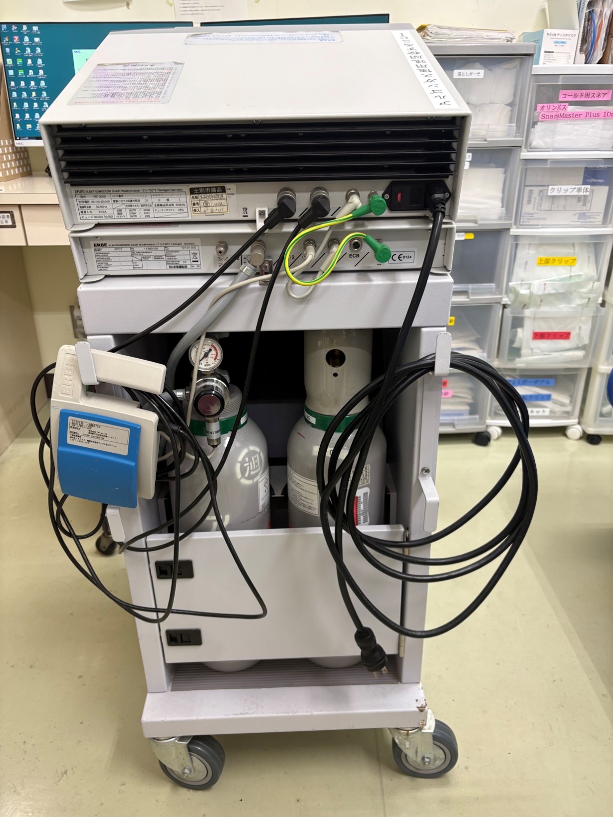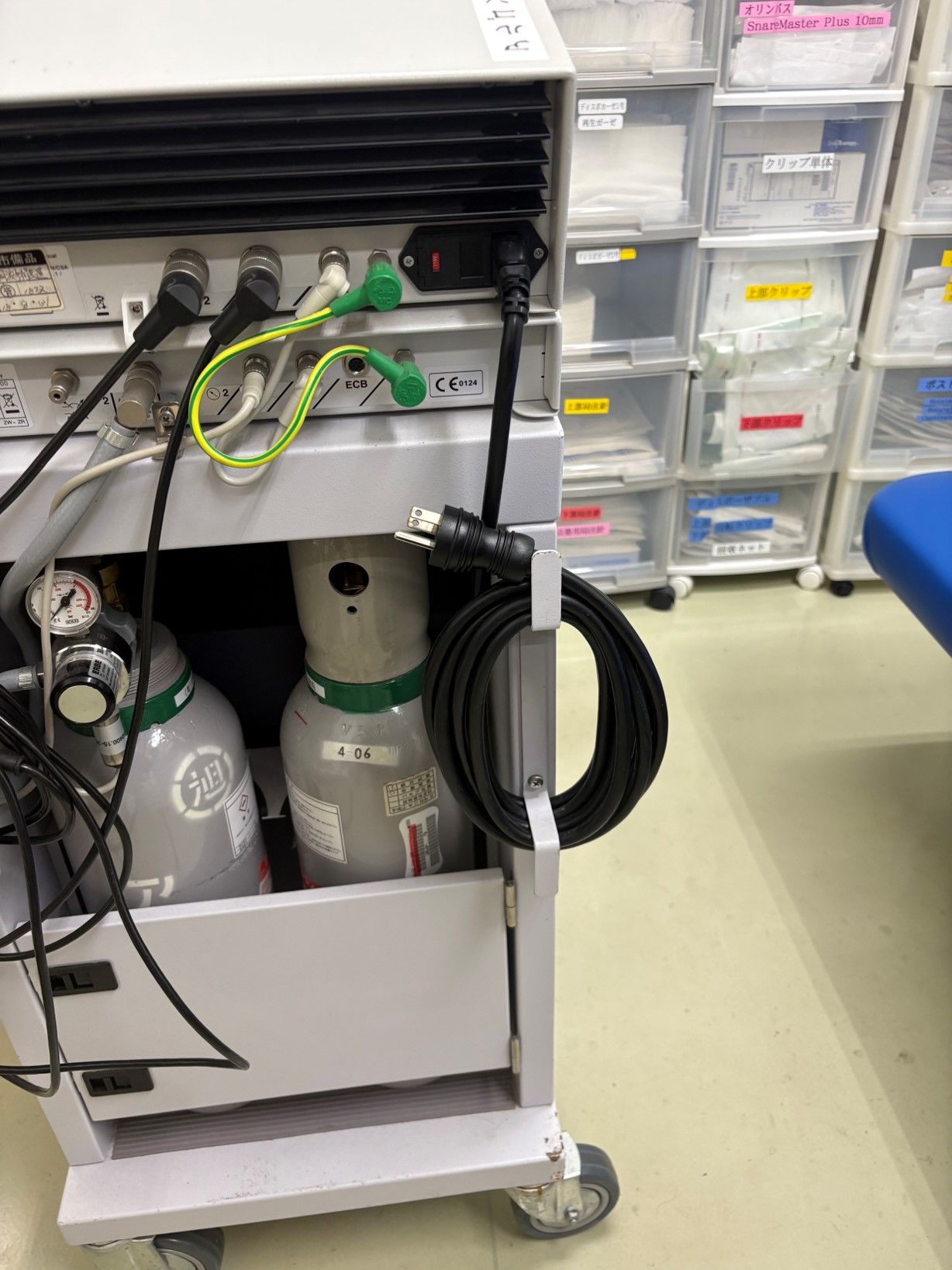 検査・治療といった手技に加え、士別市立病院では準備や後処置など、内視鏡を取り扱う手順についても統一を進めてきました。スコープの扱いには特に気を使っており、例えば操作部をトロリーにかける際には、ぐらつきが生じていないかを必ず確認。光源への接続時には、コネクター部を両手でしっかりと持ち、確実に挿入してから電源を入れるようにしています。その後の吸引器や送水タンクなどの接続も、決まった手順に沿って行います。